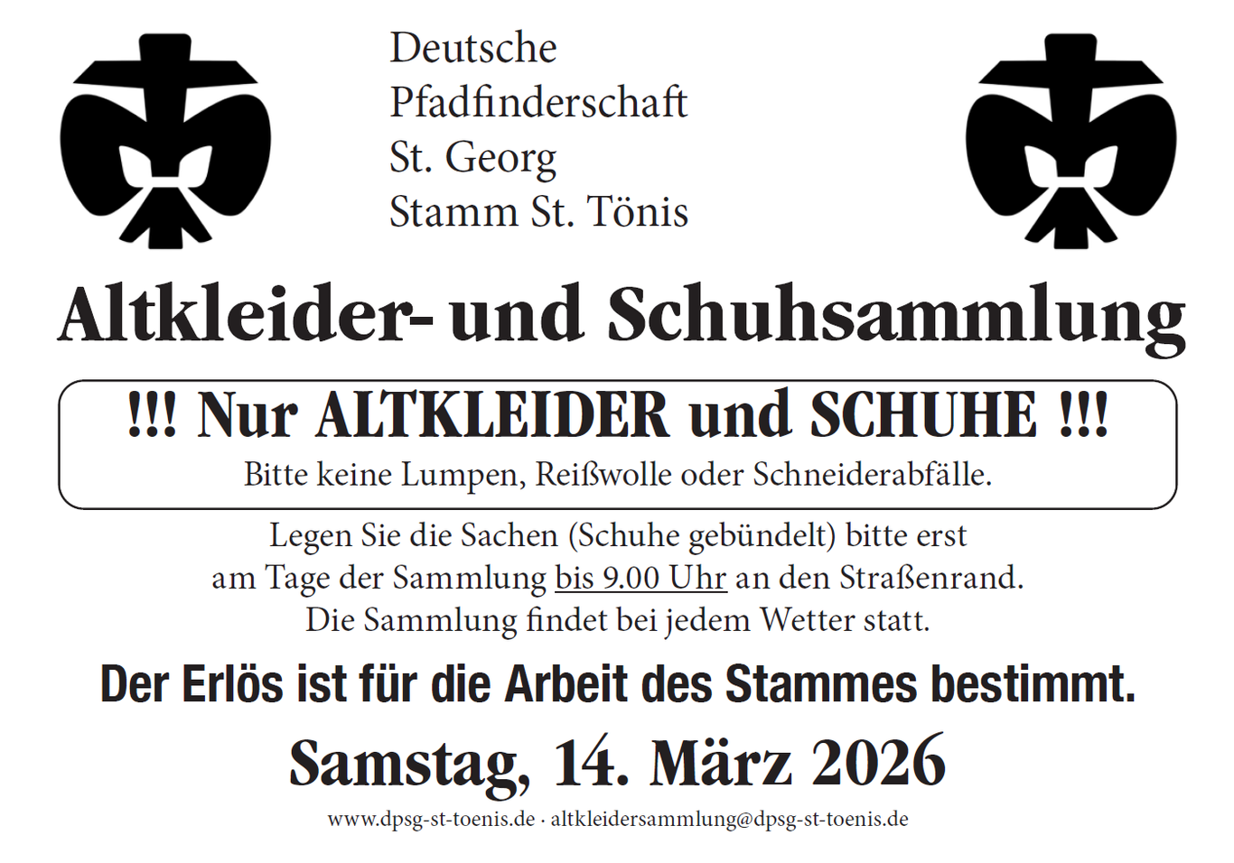Falls wir mal einen Sack bei unserer Tour übersehen sollten bitten wir Sie uns kurzfristig zu kontaktieren oder den Sack in unserem Altkleidercontainer an unserem Pfadfinderhaus zu werfen.