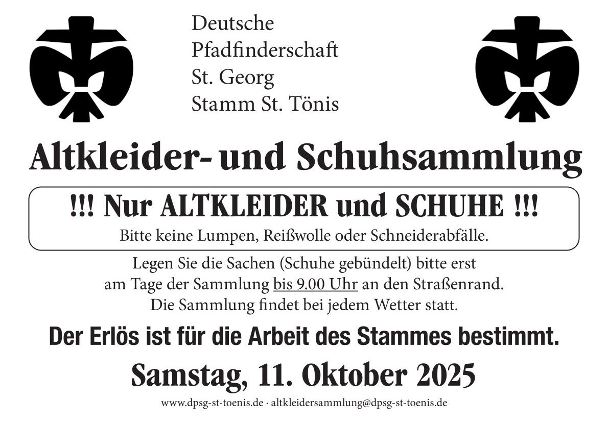 Stellen Sie einfach am Termin Ihre Altkleider verpackt auf den Bürgersteig. Wir sammeln dann die Säcke im Laufe des Tages in ganz St. Tönis usw. ein.